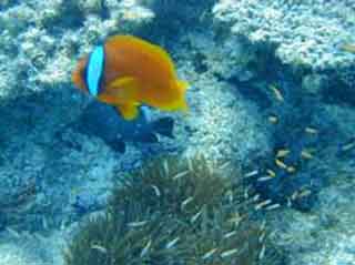 砂地にテーブルサンゴ、周りにはトロピカルフィッシュがいっぱい