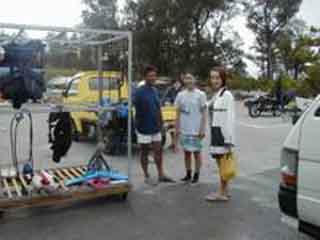 沖縄の暑い日差しの中ダイビング器材のバッグを引っぱり、歩いて“あさひ観光”まで。まさにうだるような暑さ!
