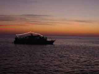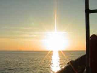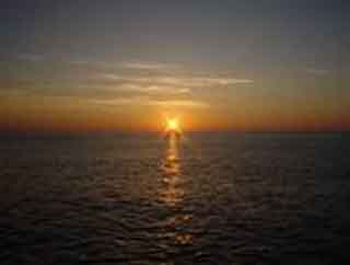 エキジットしてデッキに上がるなり、美しいサンセット。海に落ちる太陽は空と海を